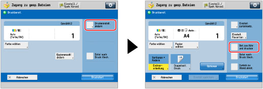 Wenn Sie die Funktion <Dateien zusammenführen und drucken> verwenden, werden die Dateien mit den Standardeinstellungen für Zugang zu gespeicherten Dateien und nicht mit den individuellen Einstellungen der jeweiligen Dateien gedruckt. Die Einstellungen der einzelnen Dateien werden jedoch weder geändert noch gelöscht und bleiben wie beim Erstellen der Datei. |