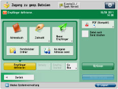 Durch Aktivieren eines Adressentyps in [Neuen Empfänger beschränken] können Sie keine neuen Empfänger dieses Typs eingeben. Wählen Sie einen gespeicherten Empfänger mithilfe des lokalen Adressbuchs, Remote-Adressbuchs, LDAP Servers in [Adressbuch] aus oder berühren Sie eine Zielwahltaste in [Zielwahl]. (Vgl. Abschnitt "Einschränken von Sendefunktionen".) |