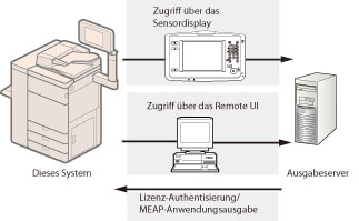 Je nach Systemoption/MEAP-Anwendung kann die Speicherung einer Lizenz erforderlich werden. Verwenden Sie SMS (Service Management Service), um die folgenden Verwaltungsvorgänge für MEAP-Anwendungen durchzuführen (Vgl. Abschnitt "MEAP".): Überprüfen der auf dem System installierten MEAP-Anwendungen Überprüfen des von den MEAP-Anwendungen verwendeten Festplattenplatzes Hinzufügen von Lizenzen für zuvor installierte MEAP-Anwendungen Die Grundeinstellung für den Login-Service ist die Default Authentisierung. Nähere Informationen zur Auswahl und zum Einstellen eines Login-Service finden Sie im Abschnitt "Auswahl des Login Services".Je nach installierter Systemoption/MEAP-Anwendung können Sie das dazugehörige Handbuch bzw. die entsprechende Software von der folgenden URL herunterladen. http://canon.com/fau/downloads Halten Sie für das Download von Anleitungen und verwandter Software für Systemoptionen/MEAP-Anwendungen die im Lieferumfang enthaltene Lizenzzugangsnummer bereit. Wenn keine Anleitung zum Download bereitsteht, lesen Sie die Erläuterungen zur entsprechenden Funktion in der vorliegenden Anleitung nach. Mehrere Anwender können die Funktion "Software speichern/aktualisieren" nicht gleichzeitig verwenden. Wenn andere Anwender beim SMS (Service Management Service) angemeldet sind, können Sie "Software speichern/aktualisieren" nicht vom Remote UI aus verwenden. Wenn Sie einen der folgenden Schritte durchführen, können Sie "Software speichern/aktualisieren" für einen bestimmten Zeitraum nicht vom Remote UI verwenden: Wenn der Remote Login Service für SMS eingestellt ist und Sie den Webbrowser ohne Berühren der Taste [Portal] oder [Log Out] schließen. Wenn der Remote Login Service für SMS nicht eingestellt ist und Sie den Webbrowser ohne Berühren der Taste [Portal] schließen. Wenn Sie den Webbrowser ohne Berühren der Taste [Log Out from SMS], [To Remote UI] oder [Log Out] für SMS schließen. |