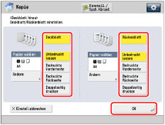 Bei Auswahl von [Unbedruckt lassen] für das Deckblatt und/oder Rückenblatt fügt das System dafür ein Blatt von dem Zufuhrmedium ein, das Sie in Schritt 3 dafür gewählt haben. Wenn Sie das Deckblatt vom Zuschiesseinheit N1 zuführen, wählen Sie [Unbedruckt lassen]. Wenn Sie bereits bedrucktes Papier als Deck- oder Rückenblatt einfügen wollen (z. B. mit Firmenlogo), wählen Sie [Unbedruckt lassen]. Andernfalls wird über den Vordruck kopiert. Bei Auswahl von [Druck auf Vorderseite], [Druck auf Rückseite] oder [Druck auf beide Seiten] für das Deckblatt und/oder Rückenblatt fügt das System dafür ein Blatt von dem Zufuhrmedium ein, das Sie in Schritt 3 dafür gewählt haben. Das System kopiert dann auf die Vorderseite, Rückseite oder auf die Vorder- und Rückseite des Deckblatts und/oder Rückenblatts. |