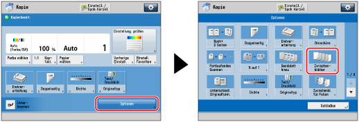 Die Einstellungen werden in der Reihenfolge des Einfügens verändet. Sie können die Einstellungen für Zwischenblätter, Kapitelseiten oder Registerblätter bestätigen/ändern, indem Sie nach der Auswahl der Einstellungen die Taste [Details/Bearbeiten] berühren. Zum Löschen eines Zwischenblatts wählen Sie die zu löschende Einstellung → Berühren Sie die Taste [Löschen]. Vergewissern Sie sich, dass die Anzahl der Registerblätter, die im Display zur Einstellung der Versatzbreite beim Drucken von Registerblättern angezeigt wird, mit der Anzahl der im Zufuhrmedium liegenden Registerblätter identisch ist. |