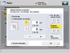 Sie können die Taste [Details einstellen] berühren, um die Druckposition zu justieren und die Druckposition für die Rückseite bei doppelseitigem Kopieren festzulegen.