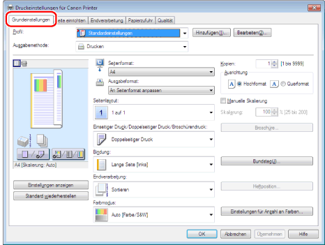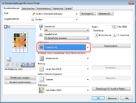 [Posterdruck] kann unter folgenden Bedingungen gewählt werden: Auf der Registerkarte [Grundeinstellungen] ist unter [Einseitiger Druck/Doppelseitiger Druck/Broschürendruck] die Option [Einseitendruck] ausgewählt. Nähere Informationen finden Sie unter "Einseitendruck/Doppelseitiger Druck". Auf der Registerkarte [Geräteeinstellungen] ist unter [Spoolen auf Host] die Option [Auto] oder [Aktiviert] gewählt. Nähere Informationen zum Anzeigen der Registerkarte [Geräteeinstellungen] finden Sie unter "Festlegen der Druckeroptionen". |