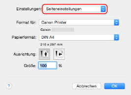 Wählen Sie unter [Format für] den Drucker aus → Legen Sie gegebenenfalls die Einstellungen zu [Papierformat], [Ausrichtung] und [Größe] fest.