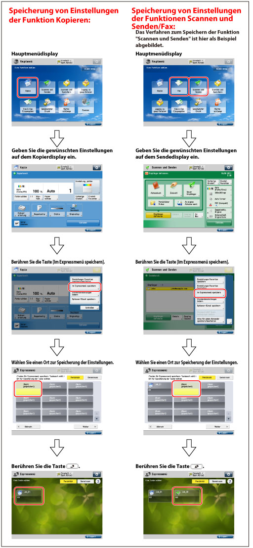 Für alle Einstellungen der Funktionen [Kopie] und [Scannen und Senden], die nicht in den gespeicherten Einstellungen enthalten sind, werden Standardeinstellungen verwendet. Eine Anleitung zum Speichern einer persönlichen/gemeinsamen Taste finden Sie am Beispiel der Funktion Scannen und Senden im Abschnitt "Speichern von persönlichen/gemeinsamen Tasten". Nähere Informationen zur erforderlichen Zusatzausstattung für die Funktionen Kopie, Scannen und Senden, Fax sowie Scannen und Speichern finden Sie im Abschnitt "Erforderliche Zusatzprodukte für die einzelnen Funktionen". |
