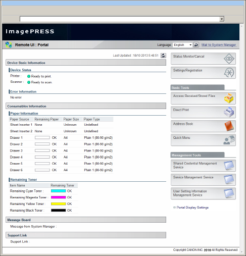 Mithilfe des Remote UI können Sie über das Netzwerk auf das System zugreifen und die Meldungen zum aktuellen Status, den Systemeinstellungen sowie zum Status aller Informationen und zur Jobverarbeitung abrufen. Sie können das System über einen Computer im selben Netzwerk verwalten und müssen die Aktionen nicht am System selbst vornehmen. Beim Aufrufen der IP-Adresse des Systems mit Ihrem Webbrowser wird folgende Startseite der Remote UI-Software auf dem Computerbildschirm angezeigt: