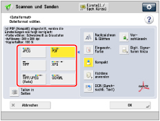 → [Scannen und Senden] → Geben Sie den Empfänger an → Berühren Sie die Taste für das Dateiformat.