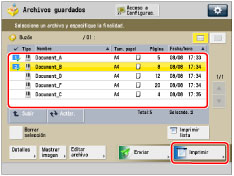 Los archivos seleccionados se numeran en el orden especificado y se imprimen en ese orden. Puede cancelar una selección seleccionando de nuevo el archivo. Para cancelar todas las selecciones de archivos, pulse [Borrar selección]. ([Borrar selección] cambia a [Seleccionar todo (máx.100 archiv.)].) Si hay dos o más archivos guardados en el buzón, puede pulsar [Nombre] o [Fecha/hora] para ordenar la lista de archivos. Si cierra el buzón tras ordenar los archivos, éstos estarán sin ordenar la próxima vez que abra el buzón. Si un archivo se guarda en el buzón desde un ordenador o si se elimina un archivo del buzón tras ordenar los archivos, la lista actualizada permanecerá ordenada. Si pulsa [Nombre] o [Fecha/hora] teniendo un archivo seleccionado, ese archivo queda sin seleccionar y aparece la parte superior de la lista de archivos. |