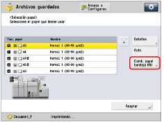 Puede guardar tipos de papel que no aparecen en la lista de configuración detallada en <Cambiar papel de bandeja multiuso: Tipo de papel>. Para más información acerca de cómo guardar el tipo de papel, consulte "Guardar tipos de papel personalizados".Si hay más de un trabajo reservado a la espera de ser impreso, sólo aparecerá en la pantalla de selección de papel el último tamaño y tipo de papel especificado para el trabajo de impresión reservado. |