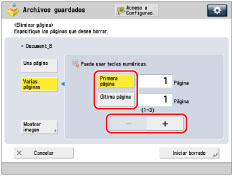 Pulse [Primera página] y [Última página] → especifique la primera página y la última que desee eliminar con [-] o [+].