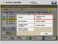 Si crea un archivo sin darle un nombre, el equipo asigna automáticamente un nombre al archivo fusionado con el año, el mes, el día y la hora en que se creó el archivo. Por ejemplo, si se creó un archivo fusionado a las 13:35:41 del 15 de enero de 2016, su nombre será <20160115133541>. Si se guardaron opciones de impresión de los archivos seleccionados, las opciones no se aplican al nuevo archivo. |