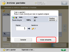Si aparece la siguiente pantalla después de leer el último lote de originales, pulse [Iniciar almacmto.].