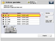 Si carga el papel desde la Bandeja de Alimentación B1 para el trabajo actual, podrá seleccionarlo para el siguiente trabajo en [Camb. papel bandeja MU]. (Consulte "Reservar un trabajo de impresión utilizando la Bandeja de Alimentación B1".) Si pulsa [Detalles], aparece la información detallada correspondiente al papel seleccionado. Si pulsa , puede cambiar si desea que se muestre la ilustración del dispositivo. Para más información, consulte "Cambiar la vista prefijada de la pantalla de lista de selección de papel ". |