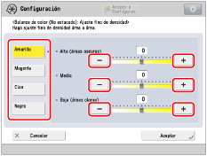 Seleccione el color que desee ajustar → pulse [-] o [+] para ajustar el nivel de densidad para las zonas de densidad más oscura (alta), media, y más clara (baja).