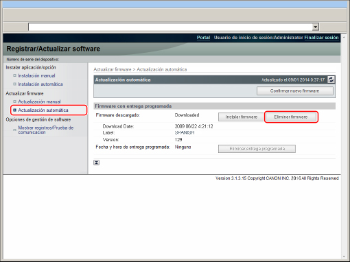 Haga clic en [Actualización automática] → [Eliminar firmware].