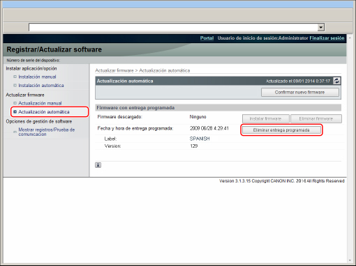 Pulse [Actualizar firmware] → [Eliminar entrega programada].