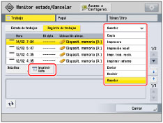 Si está activado Kit AMS(Access Management System) cuando un usuario general que ha iniciado sesión imprime un informe de registro de almacenamiento, los trabajos realizados por otros usuarios se imprimen con "***" en la columna Guardar en. Para ver la información en la columna Guardar en, inicie sesión como administrador. |