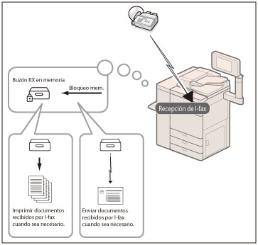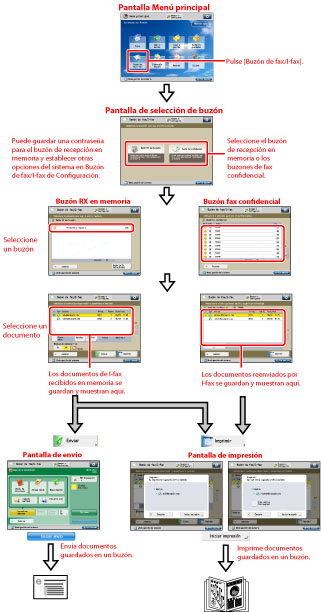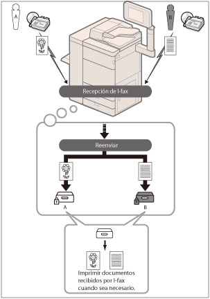 Si los archivos de imágenes adjuntos a los documentos de I-fax recibidos no son compatibles con este equipo, estos archivos no se procesan (imprimir, reenviar o guardar). En su lugar, se eliminan. En este caso, los nombres de los archivos eliminados y el mensaje <No es posible procesar el archivo adjunto con ningún programa.> se imprimen con el texto del I-fax recibido. Se recomienda eliminar de los buzones de fax/I-fax los archivos o datos de imagen que no sean necesarios para dejar espacio libre para guardar nuevos archivos. [Enviarme a mí] aparece sólo si guarda una dirección de e-mail de usuario cuando se utiliza la autenticación mediante SSO-H. [Carpeta personal] aparece sólo si establece autenticación mediante un servicio de inicio de sesión como SSO-H. |