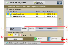 1 | Seleccionar todo (máx. 32 archiv.)/Borrar selección Se pulsa para seleccionar todos los archivos que hay en el buzón. Si selecciona un archivo, esta tecla cambia a [Borrar selección]. |