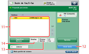 9 | [Enviarme a mí] Se pulsa para especificar la propia dirección de e-mail como destino. El administrador puede restringir usuarios generales para que envíen e-mail sólo a sus direcciones. (Consulte "Establecer destino limitado para enviar e-mail".) |