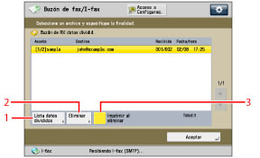 1 | [Lista datos divididos] Se pulsa para comprobar el estado de los datos divididos y la capacidad que queda en el buzón de recepción de datos divididos. |
