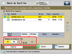 [Sí]: | Los archivos recibidos se guardan en el buzón de recepción en memoria. |