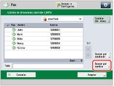 La información que se puede obtener a través del servidor LDAP consiste únicamente en nombres y números de fax. No es posible especificar directamente, como destino de reenvío, un destino obtenido a través de un servidor. Para especificar dicho destino como destino de reenvío, es necesario guardarlo previamente en la libreta de direcciones local. (Consulte "Guardar direcciones obtenidas a través de un servidor LDAP".) |