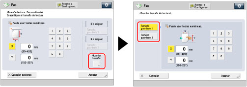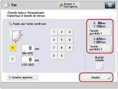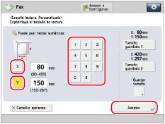 Pulse [X] y [Y] → introduzca un tamaño de lectura con las teclas numéricas → pulse [Aceptar].