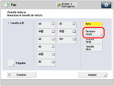Pulse [Personalizado] → seleccione [Tamaño guardado 1] o [Tamaño guardado 2] → Pulse [Aceptar].