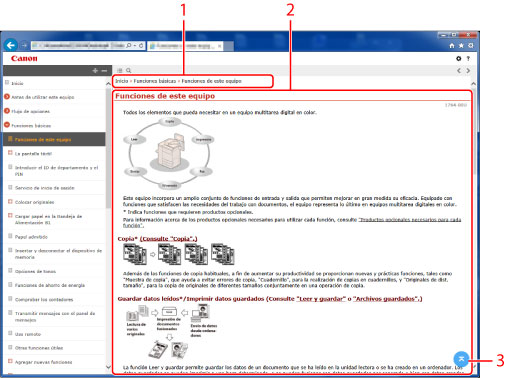 Las páginas de explicación de cada categoría de la guía de usuario se denominan "temas". Se presentan en pantallas parecidas a la que hay a continuación.