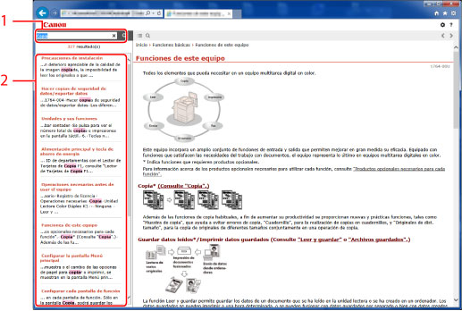 2. | Resultado de la búsqueda Aparecen los resultados de la búsqueda de una palabra clave. Si hay más de 10 resultados, puede ver los resultados restantes haciendo clic en [Mostrar más...], debajo de los resultados. |