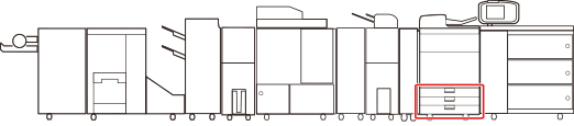 Desplace las guías hasta que encajen en su sitio. Si la guía izquierda y la guía frontal no se alinean bien, el tamaño del papel no aparecerá correctamente en la pantalla táctil. También es necesario ajustar las guías correctamente para evitar que se produzcan atascos de papel, impresiones con manchas o que se ensucie el interior del equipo. |