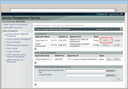 Default Authentication (Gestión de ID de departamentos) se establece en un estado utilizable por defecto. Si quiere utilizar SSO-H, desactive [Gestión de ID de departamentos] antes de cambiar el servicio de inicio de sesión. Para más información acerca de las opciones de Gestión de ID de departamentos, consulte "Especificar la gestión de ID de departamentos". |