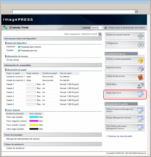 Si introdujo <http://<dirección IP o nombre de host del equipo>:8000/sso/>, se mostrará el menú principal sin que se muestre la pantalla de la IU remota en el paso 3. |