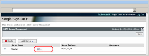 Puede hacer clic en [LDAP Server Management] sólo si selecciona [Server Authentication + Local Device Authentication] para [User Authentication System] y [LDAP Server] para [Authentication Server Type]. Al hacer clic en [LDAP Server Management] para que se muestre la pantalla [LDAP Server Management], las opciones se guardarán en [Configuration]. |