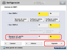 Si desea usar SNMP v. 3, pulse [Sí] para <Usar SNMPv3> → establezca el usuario y el contexto.