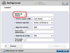 De manera predeterminada, se registra un usuario SNMP v. 3 con los siguientes valores de configuración. Elimine o cambie esos valores según sea necesario. [Nombre de usuario]: initial <Permiso de acceso a MIB>: [Lect./Escrit.] <Opciones seguridad>: [Autent. sí/Cifrado sí] <Algoritmo autentic.>: [MD5] [Contraseña autenticación]: initial <Algoritmo de cifrado>: [DES] [Contraseña de cifrado]: initial |