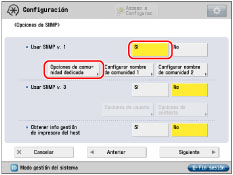 Si desea usar SNMP v. 1, pulse [Sí] para <Usar SNMPv1> → establezca los permisos de acceso MIB y los nombres de comunidad.