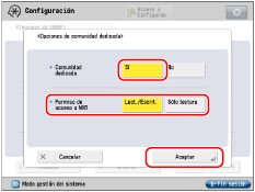 Pulse [Sí] para <Comunidad dedicada> → seleccione <Permiso de acceso a MIB>.