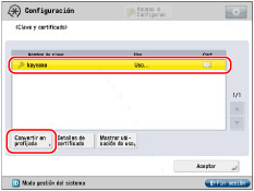 No se puede especificar 'Device Signature Key' (se usa con pares de claves para añadir firmas digitales a archivos PDF o XPS) ni 'AMS' (se usa con pares de claves para restricciones de acceso) como nombre del par de claves. Para comprobar el contenido de un certificado, seleccione un par de claves en la pantalla Clave y certificado y pulse [Detalles de certificado]. En la pantalla Detalles de certificado, puede pulsar [Verif. certif.] para verificar el certificado. Puede comprobar para qué se está utilizando un par de claves si selecciona un par de claves que muestre 'Uso' para <Estado> en la pantalla Clave y certificado y pulsa [Mostrar ubicación de uso]. |