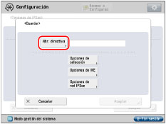 Para especificar un rango de direcciones IPv6: Pulse [Rango de direcciones]. Pulse [Primera dirección] → introduzca la primera dirección IPv6 → pulse [Aceptar]. Pulse [Última dirección] → introduzca la dirección IPv6 → pulse [Aceptar].