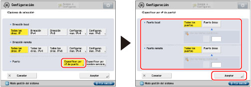 Pulse [Especificar por n.º de puerto] para <Puerto> → especifique <Puerto local> y <Puerto remoto> → pulse [Aceptar].