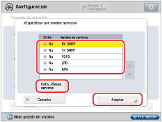 Seleccione un nombre de servicio mostrado → pulse [Activ./Desac. servicio] → pulse [Aceptar].
