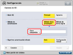 Pulse [Método clave precompart.] para <Método de autenticación> → [Clave compartida].