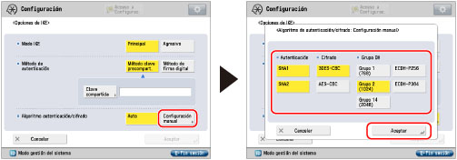 Seleccione [Configuración manual] para <Algoritmo autenticación/cifrado> → especifique el algoritmo de autenticación y cifrado que se aplicará a la IKE SA → pulse [Aceptar].