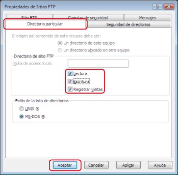 En Windows Server 2003, lleve a cabo la operación anterior en el cuadro de diálogo [Propiedades de sitio FTP predeterminado].