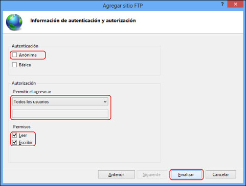 Seleccione [Leer] y [Escribir] para <Permisos> → haga clic en [Finalizar].