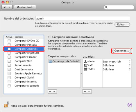 Seleccione [Compartir Archivos] → haga clic en [Opciones].