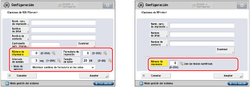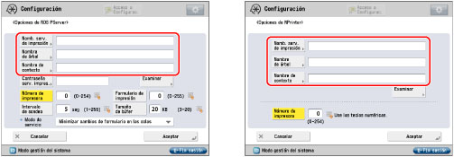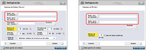 En [Nomb. servidor archivos], introduzca el nombre del servidor de archivos al que pertenece el servidor de impresión deseado → en [Nomb. serv. de impresión], introduzca el nombre del servidor de impresión deseado.