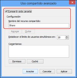 Seleccione [Compartir esta carpeta] → introduzca el nombre del recurso compartido en [Nombre del recurso compartido].
